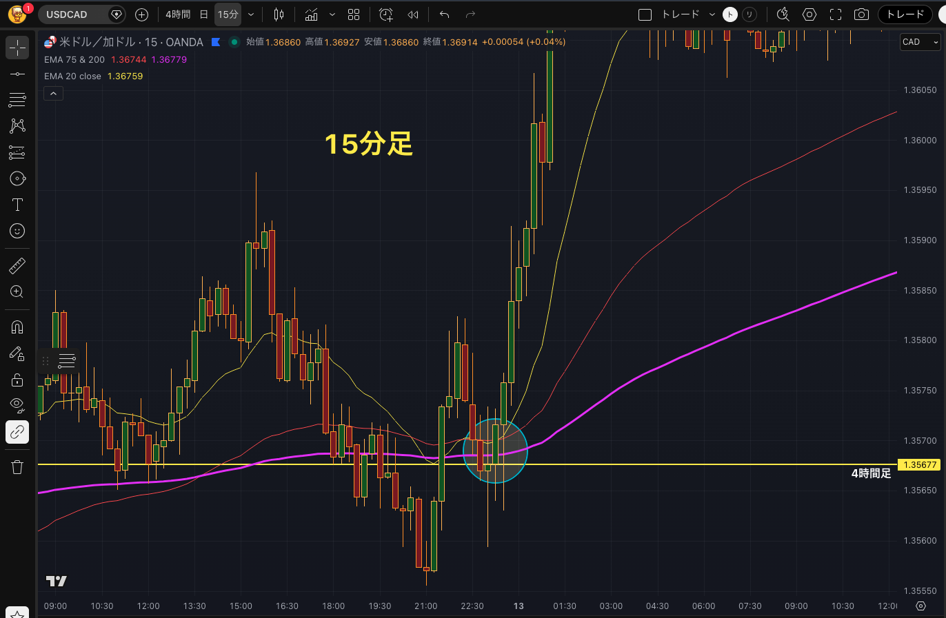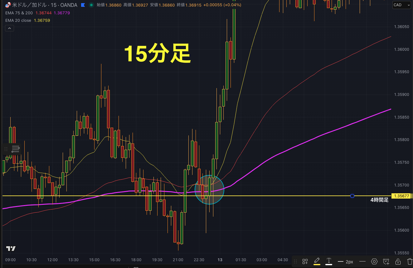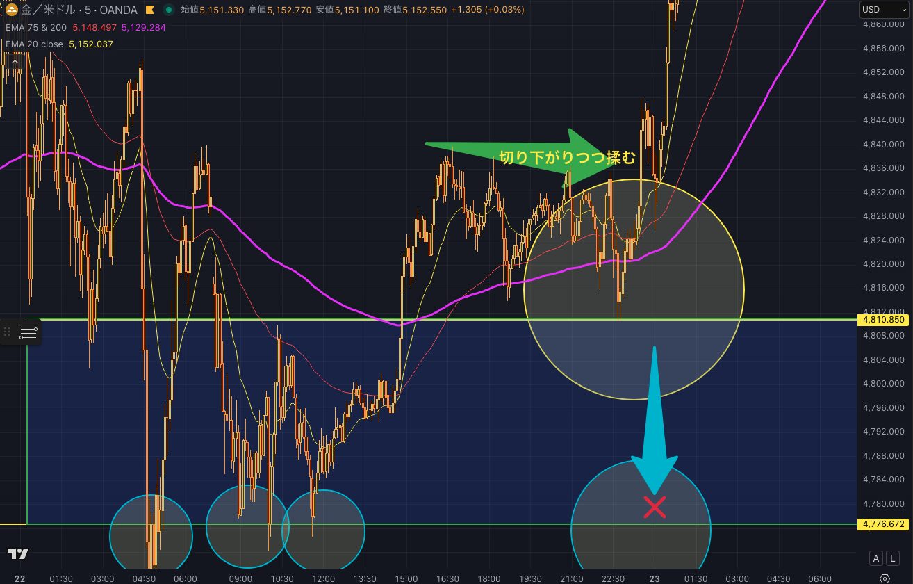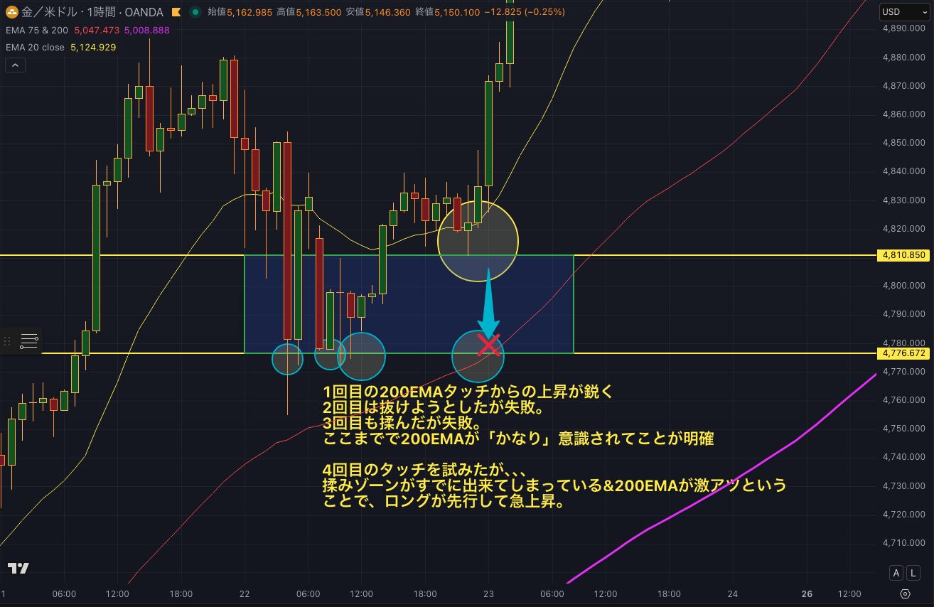 また水平線と200EMAが重なる場面は特に優位性が高くなります。根拠が複数重なるほど確度が上がるので、この条件が加わる場面は積極的に狙ってください。