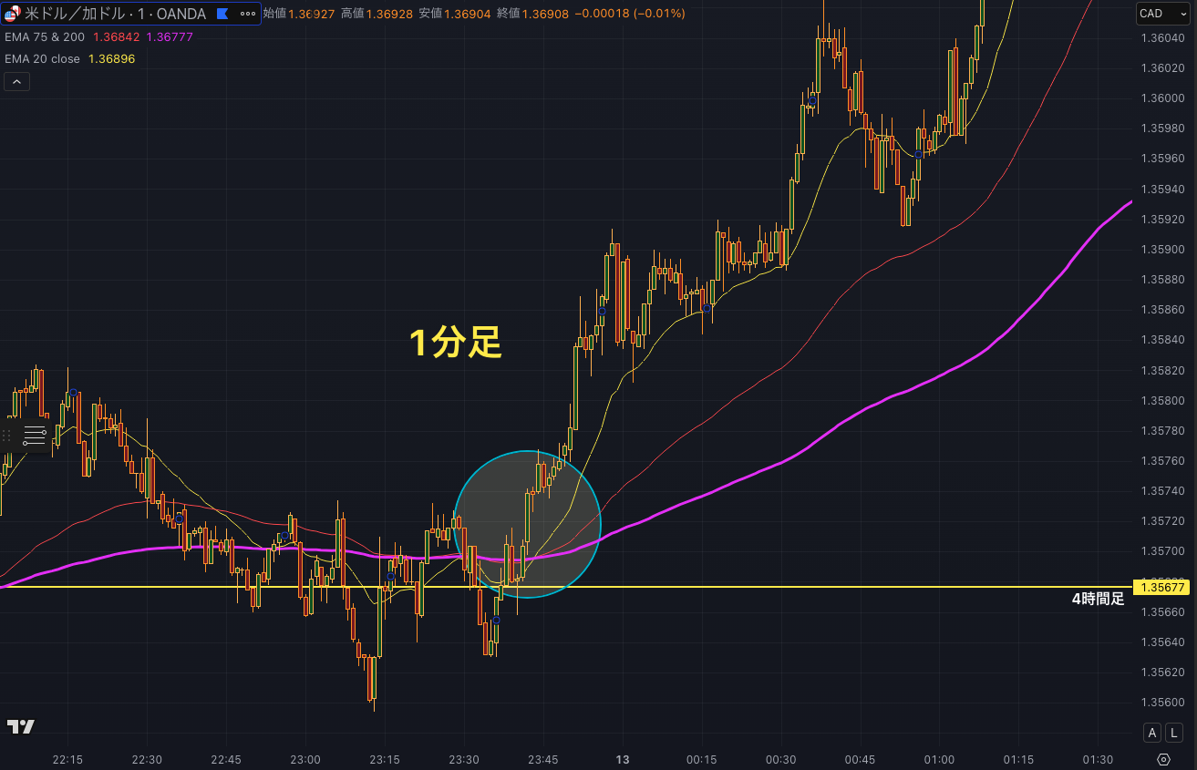 ③ 1分足に降りてロングでエントリーする